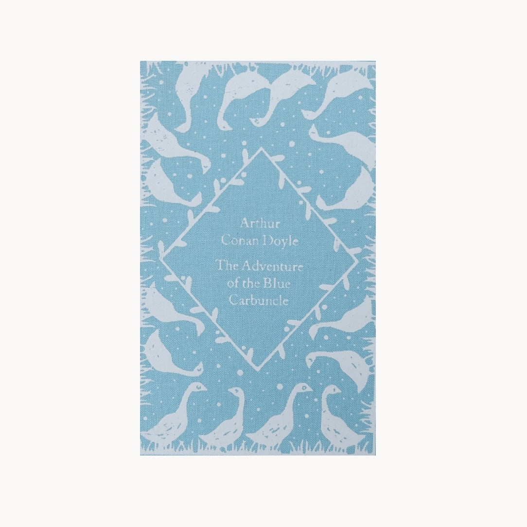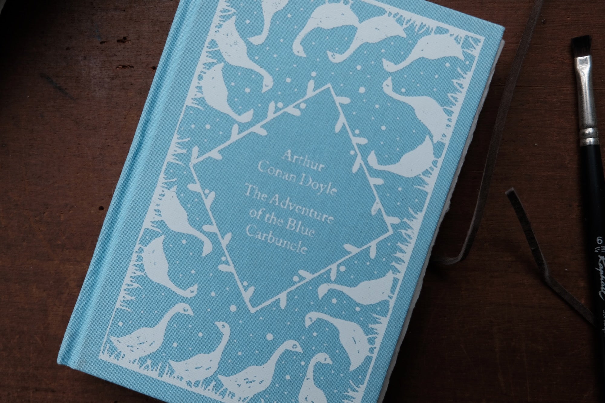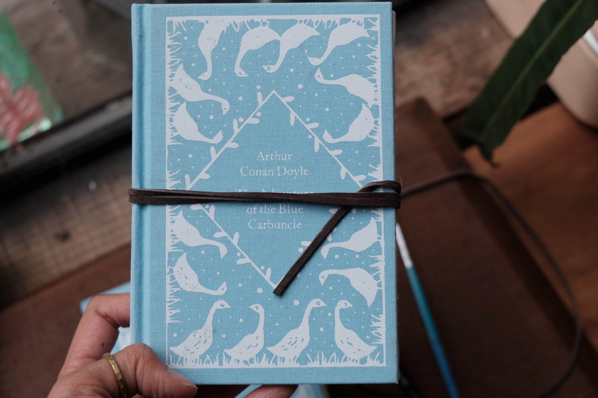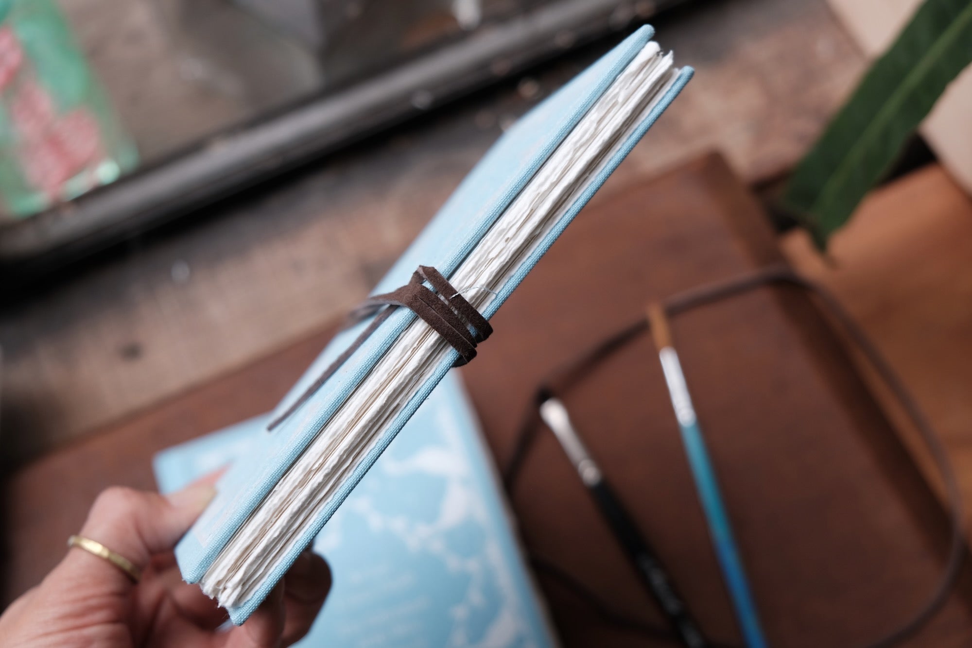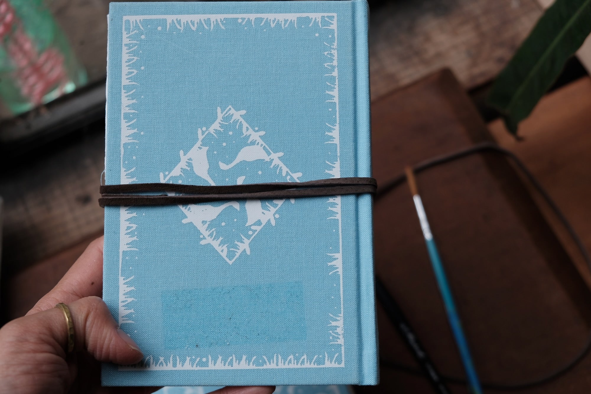 Case-bound watercolor sketchbook features a blue linen book cover with duck decorations.